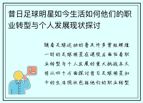 昔日足球明星如今生活如何他们的职业转型与个人发展现状探讨